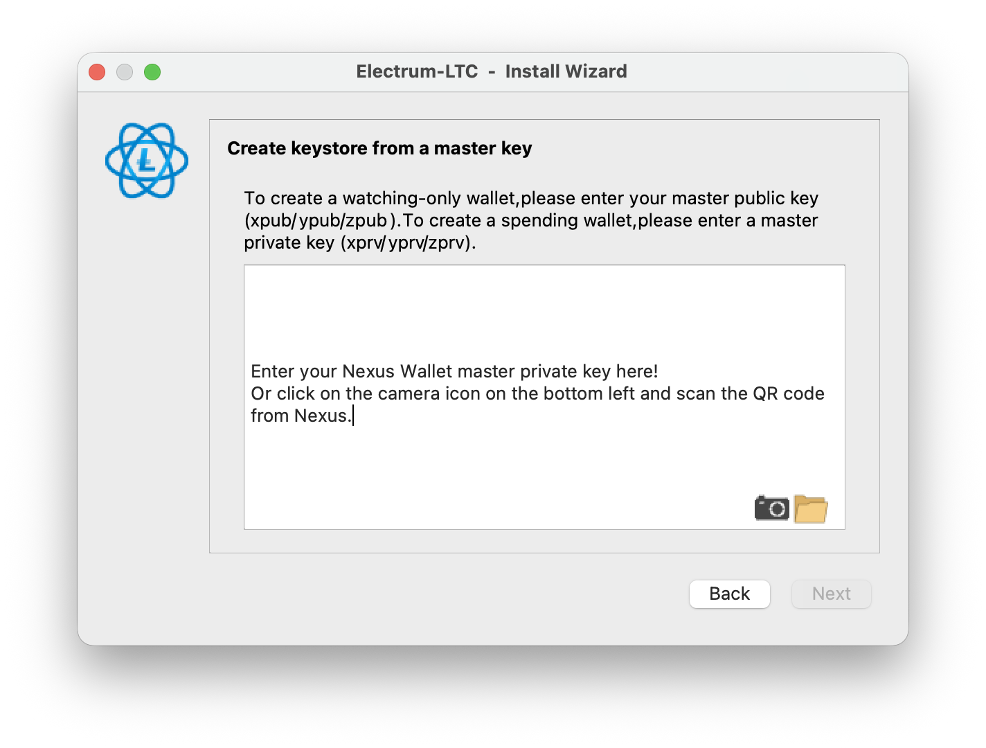 Enter your Nexus Wallet master private key. Or scan the QR code from Nexus.